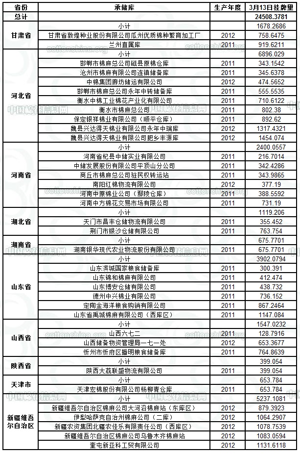 各紡織企業(yè): 定于3月13日出庫銷售儲備棉24508.3781噸。其中2011年度國產(chǎn)棉14235.9935噸,2012年度國產(chǎn)棉(新標準)10272.3846噸。今日無進口棉。相關(guān)批次公檢數(shù)據(jù)見附件。具體庫點如下: