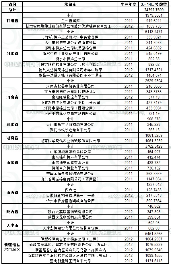各紡織企業(yè): 定于3月14日出庫銷售儲備棉24392.7609噸。其中2011年度國產(chǎn)棉14167.4635噸,2012年度國產(chǎn)棉(新標(biāo)準(zhǔn))10225.2974噸。今日無進(jìn)口棉。相關(guān)批次公檢數(shù)據(jù)見附件。具體庫點(diǎn)如下: