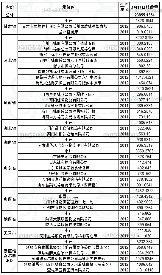 各紡織企業(yè): 定于3月17日出庫銷售儲(chǔ)備棉23855.1354噸。其中2011年度國產(chǎn)棉13786.7944噸,2012年度國產(chǎn)棉(新標(biāo)準(zhǔn))10068.341噸。今日無進(jìn)口棉。相關(guān)批次公檢數(shù)據(jù)見附件。具體庫點(diǎn)如下: