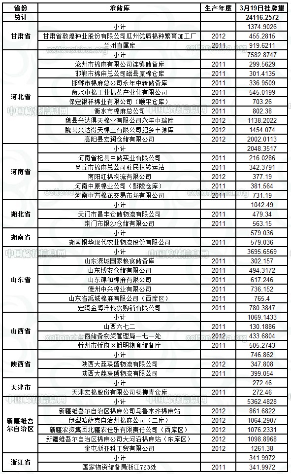 各紡織企業(yè): 定于3月19日出庫銷售儲備棉24116.2572噸。其中2011年度國產(chǎn)棉12331.3828噸,2012年度國產(chǎn)棉(新標(biāo)準(zhǔn))11784.8744噸。今日無進(jìn)口棉。相關(guān)批次公檢數(shù)據(jù)見附件。具體庫點(diǎn)如下:
