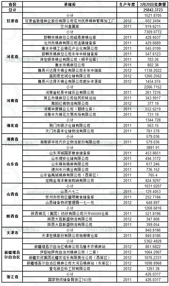 各紡織企業(yè): 定于3月20日出庫銷售儲備棉25842.3723噸。其中2011年度國產(chǎn)棉14225.181噸,2012年度國產(chǎn)棉(新標(biāo)準(zhǔn))11617.1913噸。今日無進口棉。相關(guān)批次公檢數(shù)據(jù)見附件。具體庫點如下: