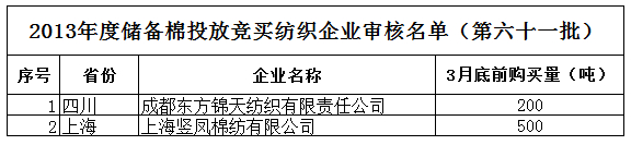 2013年度儲(chǔ)備棉投放競(jìng)買(mǎi)紡織企業(yè)審核名單(第六十一批)