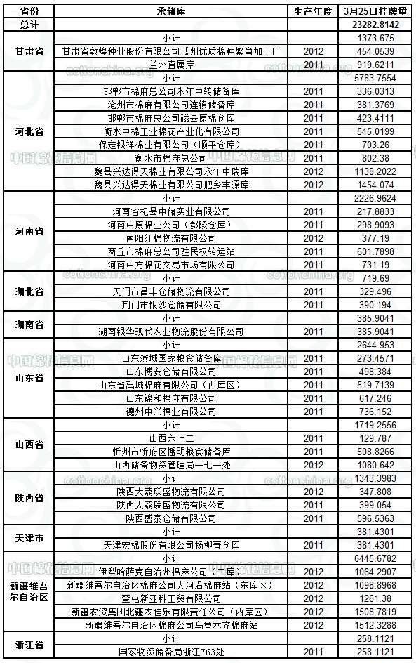 各紡織企業(yè): 定于3月25日出庫銷售儲備棉23282.8142噸。其中2011年度國產(chǎn)棉11727.0538噸,2012年度國產(chǎn)棉(新標準)11555.7604噸。今日無進口棉。相關批次公檢數(shù)據(jù)見附件。具體庫點如下: