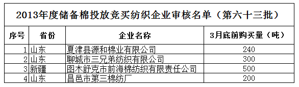2013年度儲備棉投放競買紡織企業(yè)審核名單(第六十三批)