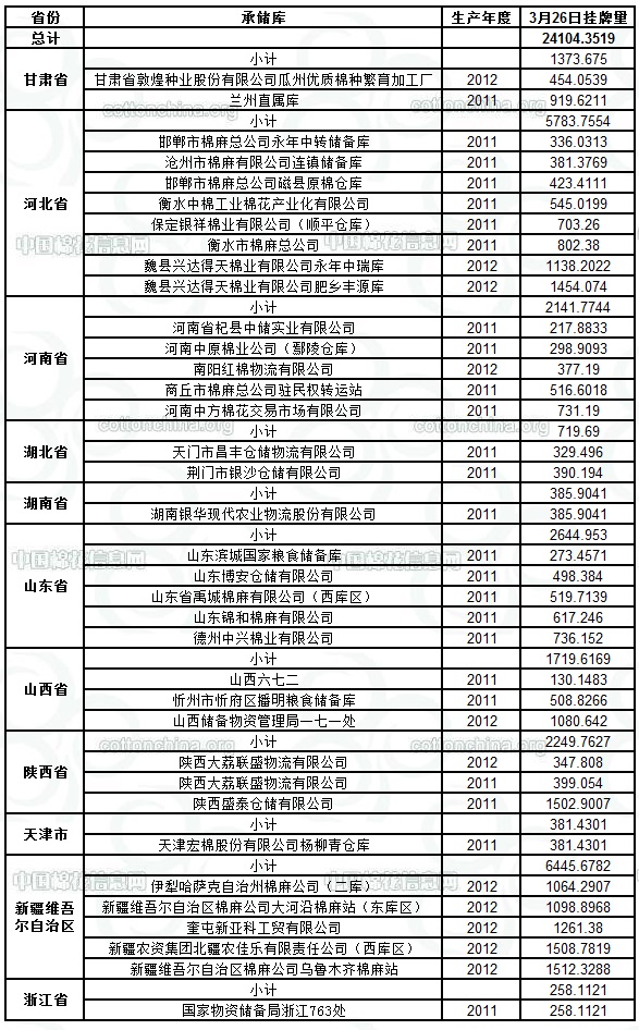 各紡織企業(yè): 定于3月26日出庫(kù)銷(xiāo)售儲(chǔ)備棉24104.3519噸。其中2011年度國(guó)產(chǎn)棉12548.5915噸,2012年度國(guó)產(chǎn)棉(新標(biāo)準(zhǔn))11555.7604噸。今日無(wú)進(jìn)口棉。相關(guān)批次公檢數(shù)據(jù)見(jiàn)附件。具體庫(kù)點(diǎn)如下: