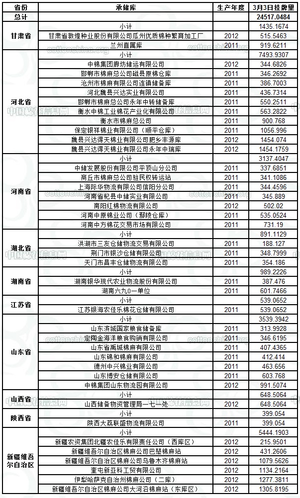 各紡織企業(yè): 定于3月3日出庫銷售儲備棉24517.0484噸。其中2011年度國產棉13162.3455噸,2012年度國產棉(新標準)11354.7029噸。今日無進口棉。相關批次公檢數(shù)據(jù)見附件。具體庫點如下: