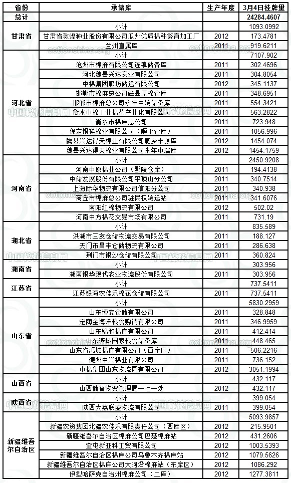 各紡織企業(yè): 定于3月4日出庫(kù)銷售儲(chǔ)備棉24284.4607噸。其中2011年度國(guó)產(chǎn)棉11778.2969噸,2012年度國(guó)產(chǎn)棉(新標(biāo)準(zhǔn))12506.1638噸。今日無(wú)進(jìn)口棉。相關(guān)批次公檢數(shù)據(jù)見(jiàn)附件。具體庫(kù)點(diǎn)如下: