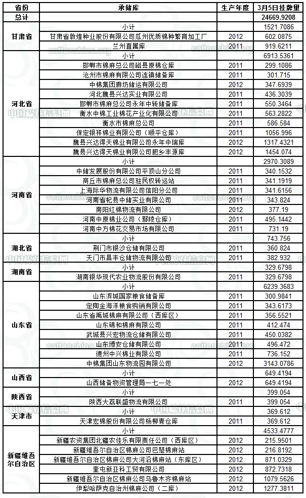 各紡織企業(yè): 定于3月5日出庫銷售儲備棉24669.9208噸。其中2011年度國產(chǎn)棉12245.4676噸,2012年度國產(chǎn)棉(新標準)12424.4532噸。今日無進口棉。相關(guān)批次公檢數(shù)據(jù)見附件。具體庫點如下: