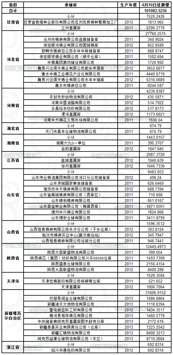 各紡織企業(yè): 定于4月10日出庫(kù)銷售儲(chǔ)備棉101082.5236噸。其中2011年度國(guó)產(chǎn)棉37605.8873噸;2012年度國(guó)產(chǎn)棉(新標(biāo)準(zhǔn))33304.0728噸,2013年度國(guó)產(chǎn)棉(新標(biāo)準(zhǔn))30172.5635噸。相關(guān)批次公檢數(shù)據(jù)見附件。具體庫(kù)點(diǎn)如下: