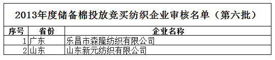2013年度儲備棉投放競買紡織企業(yè)審核名單新(第六批)