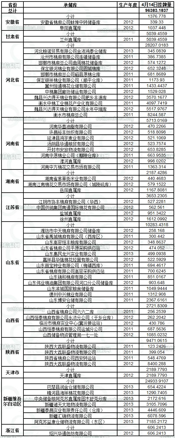 4月14日儲備棉計劃投放96383噸