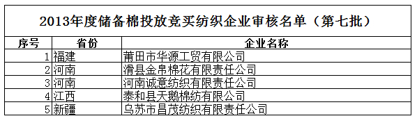 2013年度儲(chǔ)備棉投放競(jìng)買紡織企業(yè)審核名單新(第七批)