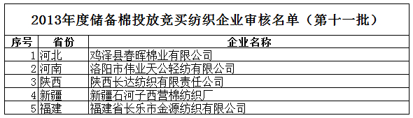 2013年度儲備棉投放競買紡織企業(yè)審核名單新(第十一批)