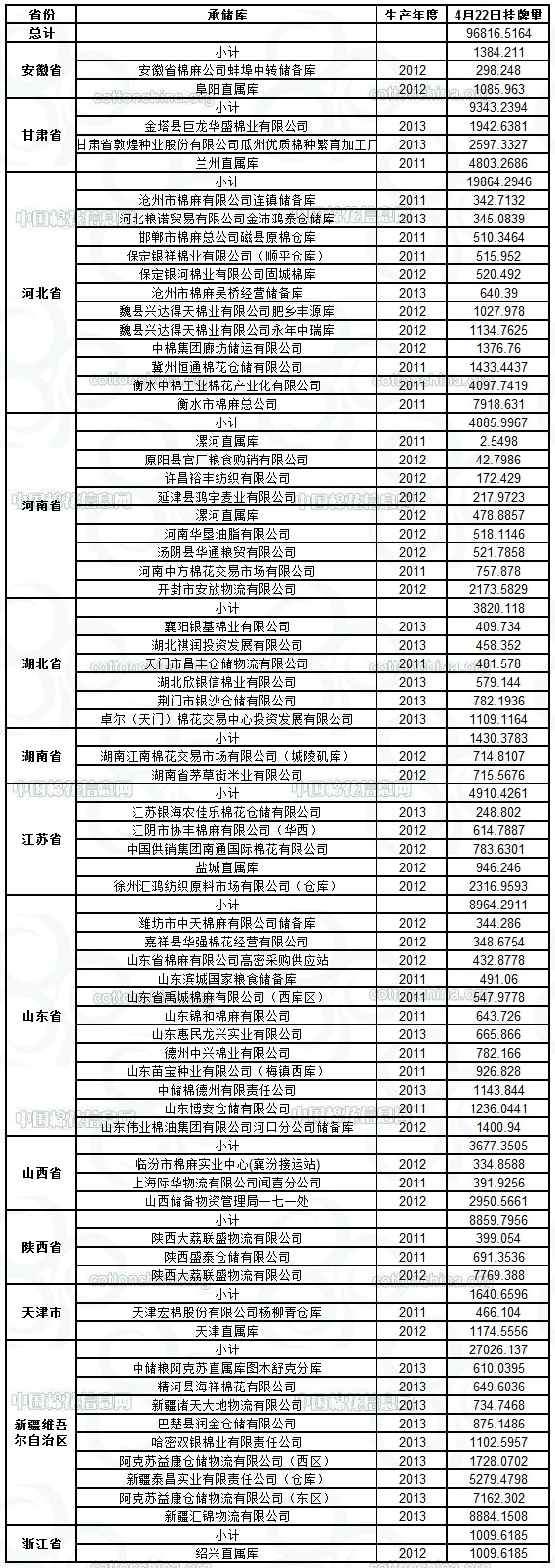 各紡織企業(yè): 定于4月22日出庫銷售儲備棉96816.5164噸。相關(guān)批次公檢數(shù)據(jù)見附件。具體庫點(diǎn)如下: