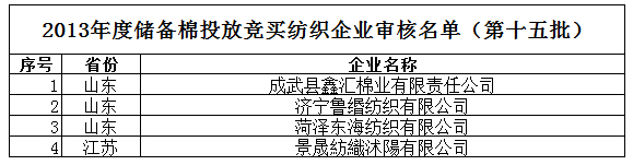 2013年度儲備棉投放競買紡織企業(yè)審核名單新(第十五批)