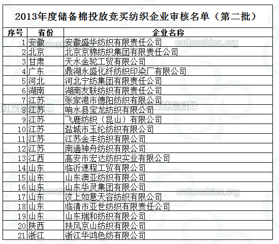 2013年度儲備棉投放競買紡織企業(yè)審核名單新(第二批)