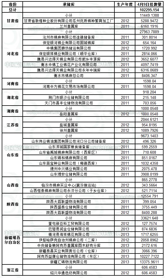 各紡織企業(yè): 定于4月9日出庫銷售儲(chǔ)備棉102295.154噸。其中2011年度國產(chǎn)棉37627.7092噸;2012年度國產(chǎn)棉(新標(biāo)準(zhǔn))33232.4504噸,2013年度國產(chǎn)棉(新標(biāo)準(zhǔn))31434.9944噸。相關(guān)批次公檢數(shù)據(jù)見附件。具體庫點(diǎn)如下: