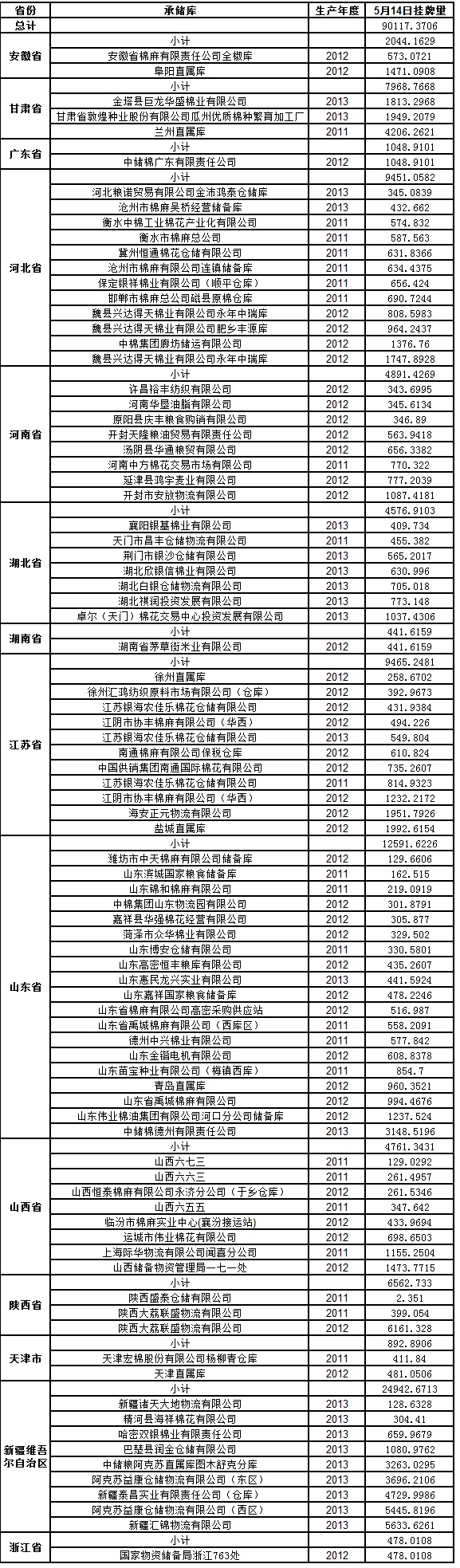 各紡織企業(yè): 定于5月14日出庫銷售儲(chǔ)備棉90117.3706噸。其中2011年度國產(chǎn)棉15432.3163噸,2012年度國產(chǎn)棉36940.6881噸,2013年度國產(chǎn)棉37744.3662噸。今日無進(jìn)口棉。相關(guān)批次公檢數(shù)據(jù)見附件。具體庫點(diǎn)如下: