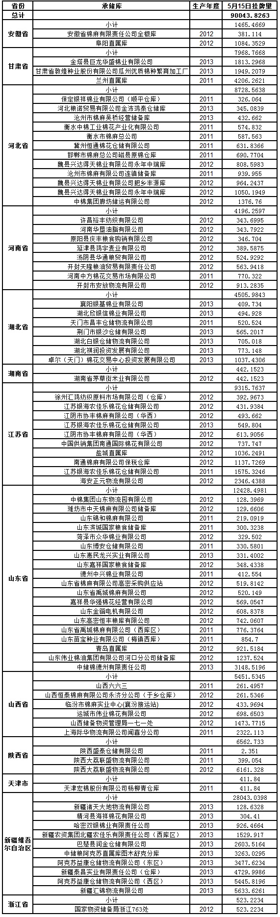 各紡織企業(yè): 定于5月14日出庫(kù)銷售儲(chǔ)備棉90043.8263噸。其中2011年度國(guó)產(chǎn)棉17113.9336噸,2012年度國(guó)產(chǎn)棉32331.4182噸,2013年度國(guó)產(chǎn)棉40598.4745噸。今日無(wú)進(jìn)口棉。相關(guān)批次公檢數(shù)據(jù)見(jiàn)附件。具體庫(kù)點(diǎn)如下: