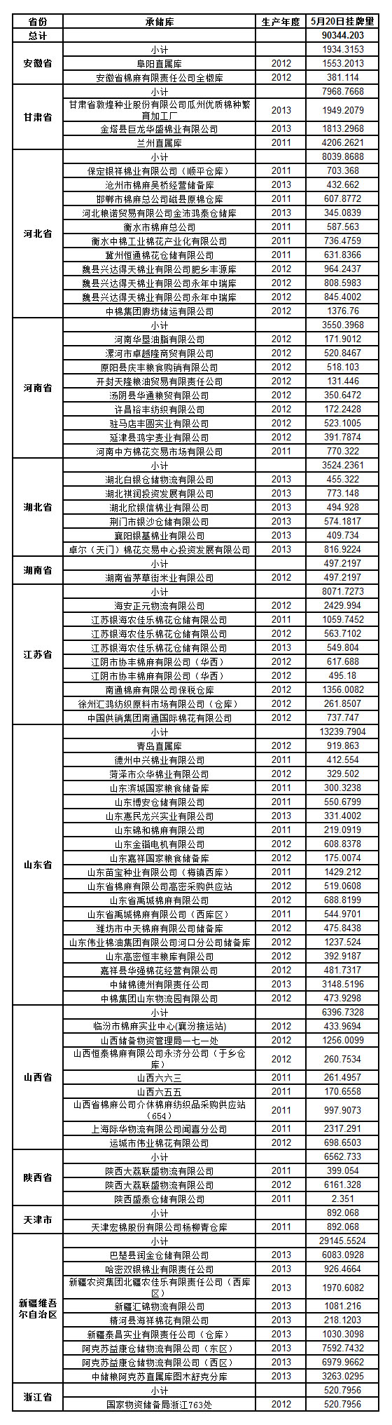 定于5月20日出庫(kù)銷售儲(chǔ)備棉90344.203噸,其中2011年度國(guó)產(chǎn)棉17801.1045噸,2012年度國(guó)產(chǎn)棉31303.3356噸,2013年度國(guó)產(chǎn)棉41239.7629噸。今日無(wú)進(jìn)口棉。相關(guān)批次公檢數(shù)據(jù)見(jiàn)附件。具體庫(kù)點(diǎn)如下: