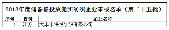 2013年度儲(chǔ)備棉投放競(jìng)買紡織企業(yè)審核名單新(第二十五批)
