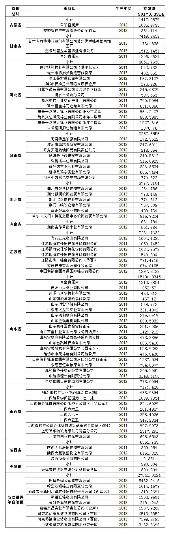 定于5月26日出庫銷售儲(chǔ)備棉90170.3314噸。其中2011年度國產(chǎn)棉18384.8584噸,2012年度國產(chǎn)棉32316.9874噸,2013年度國產(chǎn)棉39468.4856噸。相關(guān)批次公檢數(shù)據(jù)見附件。具體庫點(diǎn)如下: