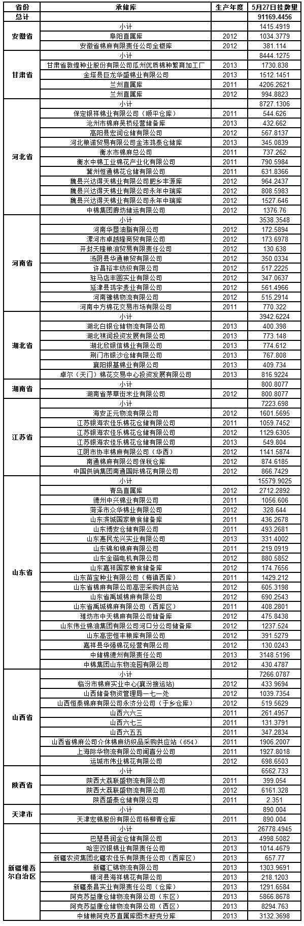 定于5月27日出庫銷售儲備棉91169.4456噸。其中2011年度國產(chǎn)棉18648.9479噸,2012年度國產(chǎn)棉33748.928噸,2013年度國產(chǎn)棉38771.5697噸。相關(guān)批次公檢數(shù)據(jù)見附件。具體庫點(diǎn)如下: