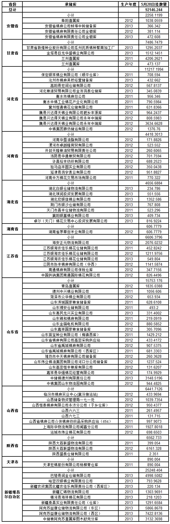 定于5月28日出庫銷售儲備棉92146.244噸。其中2011年度國產(chǎn)棉18158.4591噸,2012年度國產(chǎn)棉36152.22噸,2013年度國產(chǎn)棉37835.5649噸。相關(guān)批次公檢數(shù)據(jù)見附件。具體庫點如下: