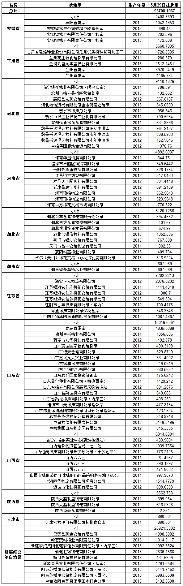 定于5月29日出庫(kù)銷(xiāo)售儲(chǔ)備棉93708.1067噸。其中2011年度國(guó)產(chǎn)棉19011.9325噸,2012年度國(guó)產(chǎn)棉34142.2393噸,2013年度國(guó)產(chǎn)棉40553.9349噸。相關(guān)批次公檢數(shù)據(jù)見(jiàn)附件。具體庫(kù)點(diǎn)如下: