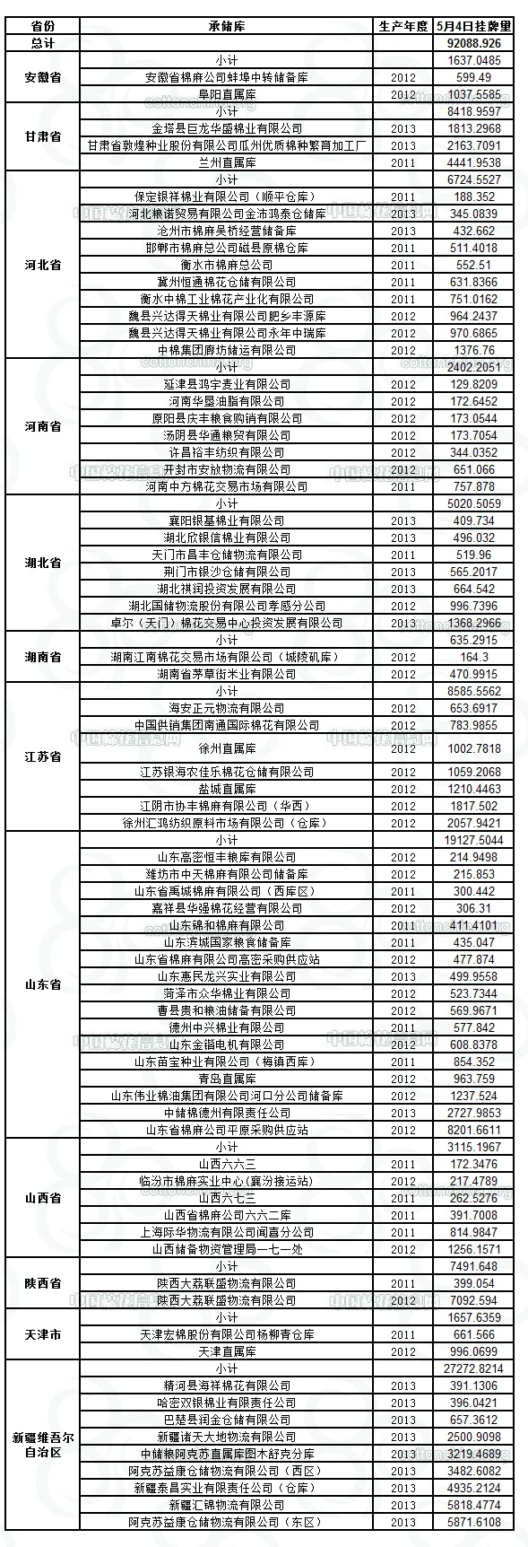 定于5月4日出庫銷售儲(chǔ)備棉92088.9260噸。其中2011年度國產(chǎn)棉13636.1822噸,2012年度國產(chǎn)棉39693.4232噸,2013年度國產(chǎn)棉38759.3206噸。今日無進(jìn)口棉。相關(guān)批次公檢數(shù)據(jù)見附件。具體庫點(diǎn)如下: