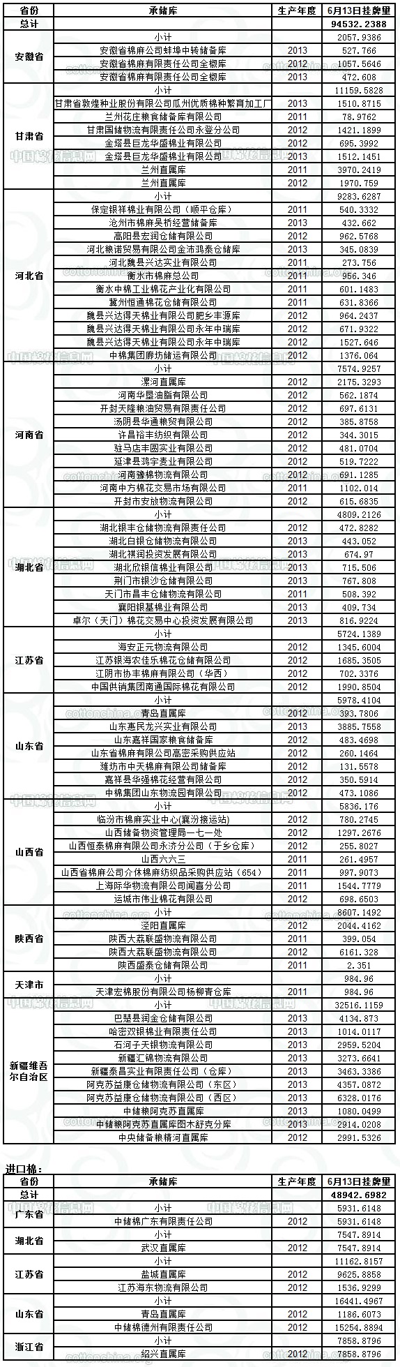 定于6月13日出庫銷售儲備棉143474.937 噸。其中國產(chǎn)棉94532.2388噸,進(jìn)口棉48942.6982噸。相關(guān)批次公檢數(shù)據(jù)見附件,具體庫點(diǎn)如下: