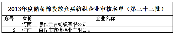 2013年度儲備棉投放競買紡織企業(yè)審核名單新(第三十三批)