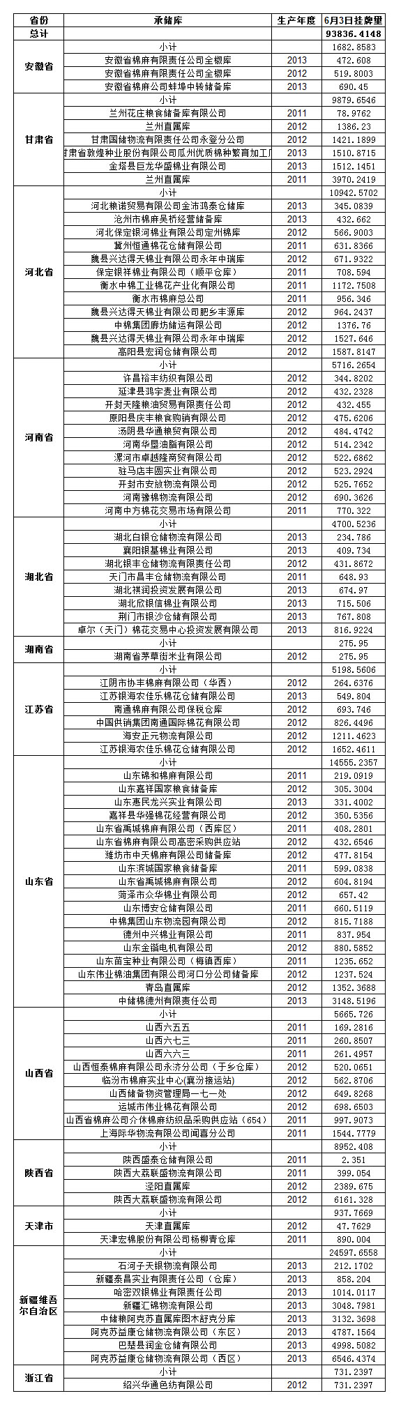 定于6月3日出庫(kù)銷(xiāo)售儲(chǔ)備棉93836.4148噸,其中2011年資源17424.2934噸,2012年資源39201.1949噸,2013年資源37210.9265噸,相關(guān)批次公檢數(shù)據(jù)見(jiàn)附件,具體庫(kù)點(diǎn)如下: