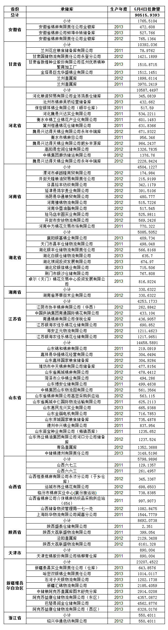 定于6月4日出庫銷售儲(chǔ)備棉90515.9393噸,其中2011年資源16936.3165噸,2012年資源37045.0833噸,2013年資源36534.5395噸,相關(guān)批次公檢數(shù)據(jù)見附件,具體庫點(diǎn)如下: