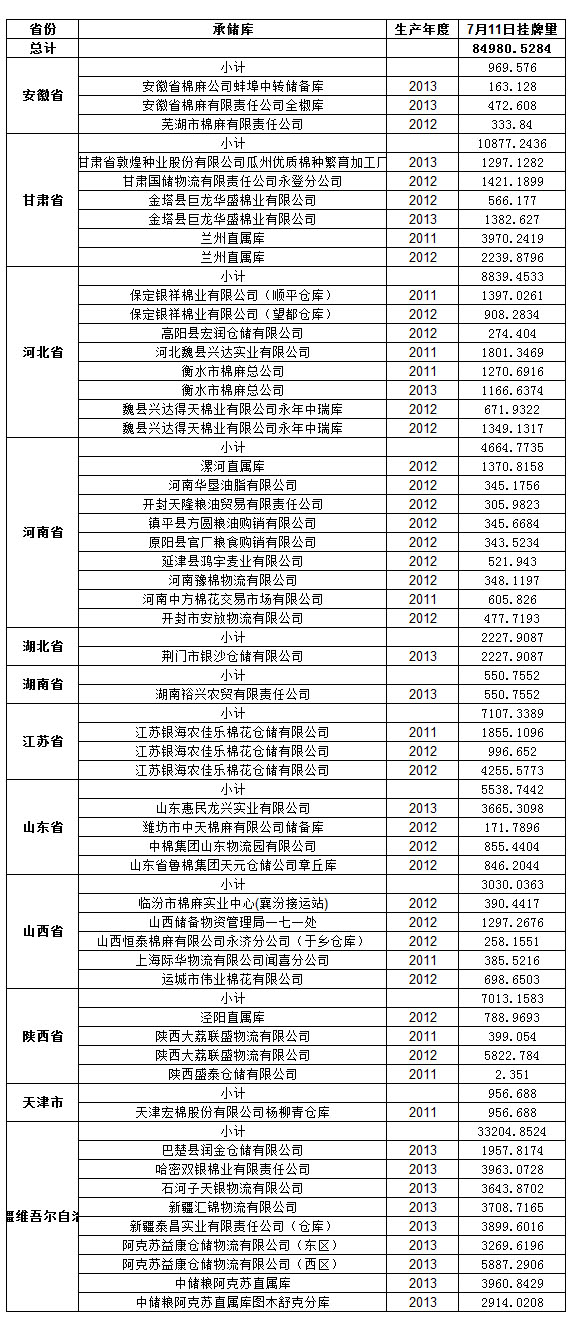 定于7月11日出庫(kù)銷(xiāo)售儲(chǔ)備棉124612.815噸。其中國(guó)產(chǎn)棉84980.5284噸(2011年資源12643.8567噸,2012年資源28205.717噸,2013年資源44130.9547噸),進(jìn)口棉39632.2866噸。相關(guān)批次公檢數(shù)據(jù)見(jiàn)附件,具體庫(kù)點(diǎn)如下: 國(guó)產(chǎn)棉: