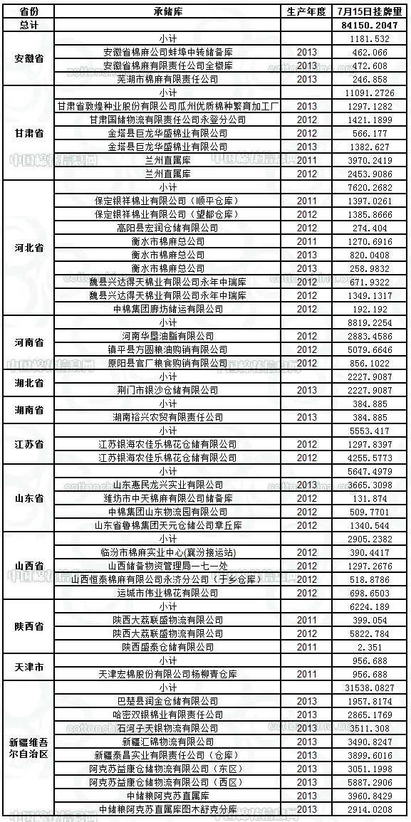 定于7月15日出庫(kù)銷售儲(chǔ)備棉84150.2047噸。其中2011年資源7996.0526噸,2012年資源33397.6547噸,2013年資源42756.4974噸。相關(guān)批次公檢數(shù)據(jù)見(jiàn)附件,具體庫(kù)點(diǎn)如下: