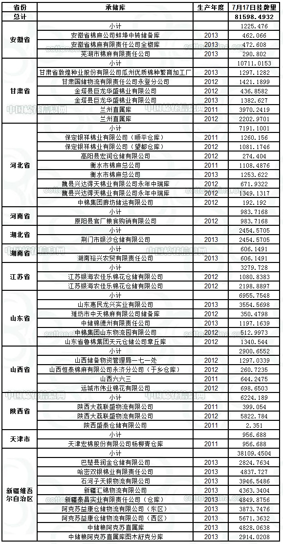 定于7月17日出庫銷售儲(chǔ)備棉81598.4932噸。其中2011年資源8341.226噸,2012年資源22176.5103噸,2013年資源51080.7569噸。相關(guān)批次公檢數(shù)據(jù)見附件,具體庫點(diǎn)如下:
