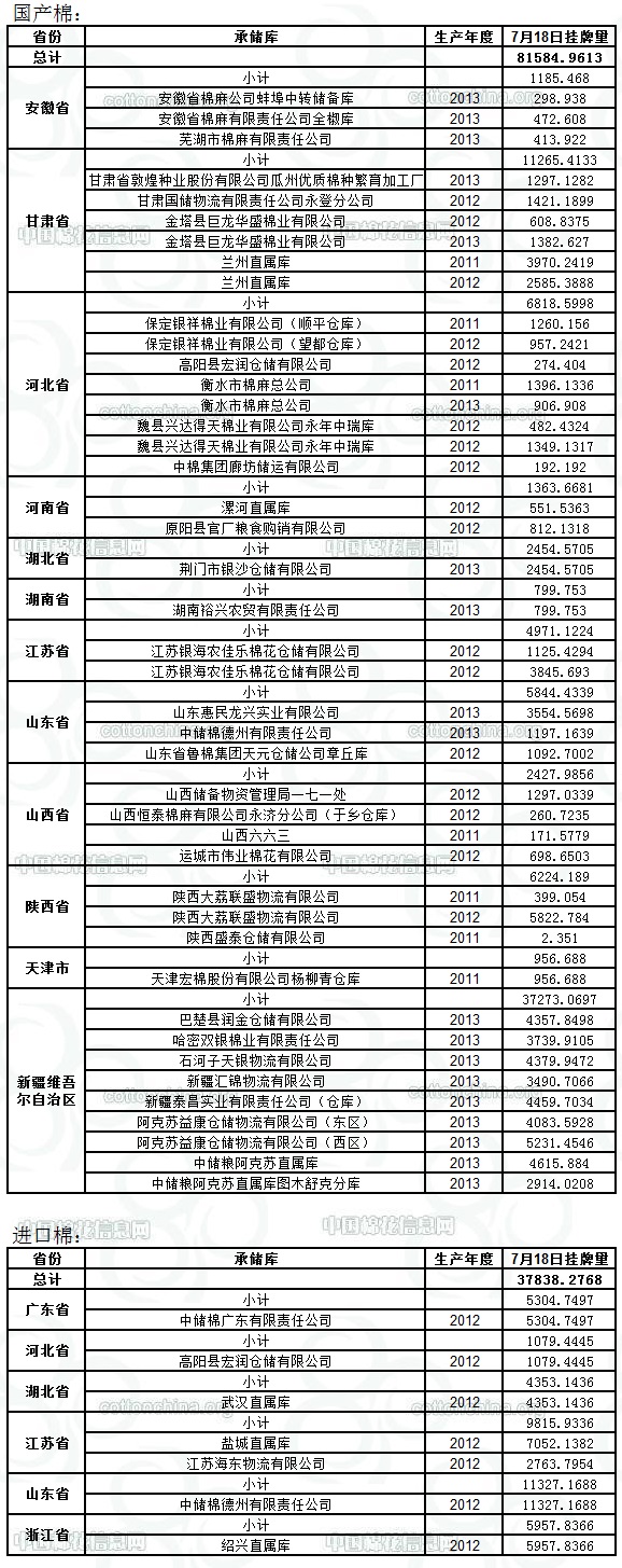 定于7月18日出庫(kù)銷售儲(chǔ)備棉119423.2381噸。其中國(guó)產(chǎn)棉81584.9613噸,進(jìn)口棉37838.2768噸。相關(guān)批次公檢數(shù)據(jù)見(jiàn)附件。具體庫(kù)點(diǎn)如下: