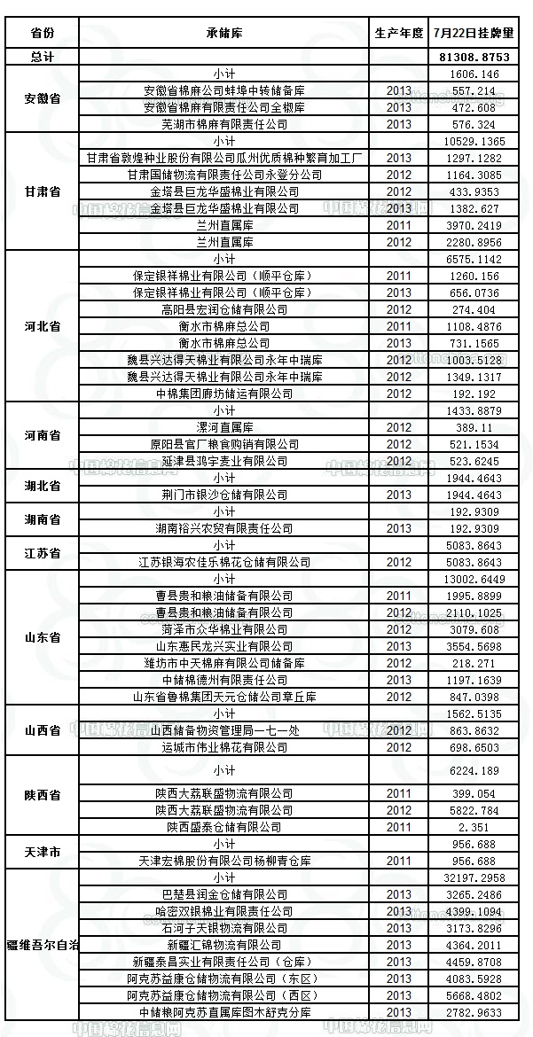 定于7月22日出庫銷售儲備棉81308.8753噸。其中2011年度國產(chǎn)棉9692.8684噸,2012年度國產(chǎn)棉26856.4509噸,2013年度國產(chǎn)棉44759.556噸。今日無進口棉。相關(guān)批次公檢數(shù)據(jù)見附件。具體庫點如下:
