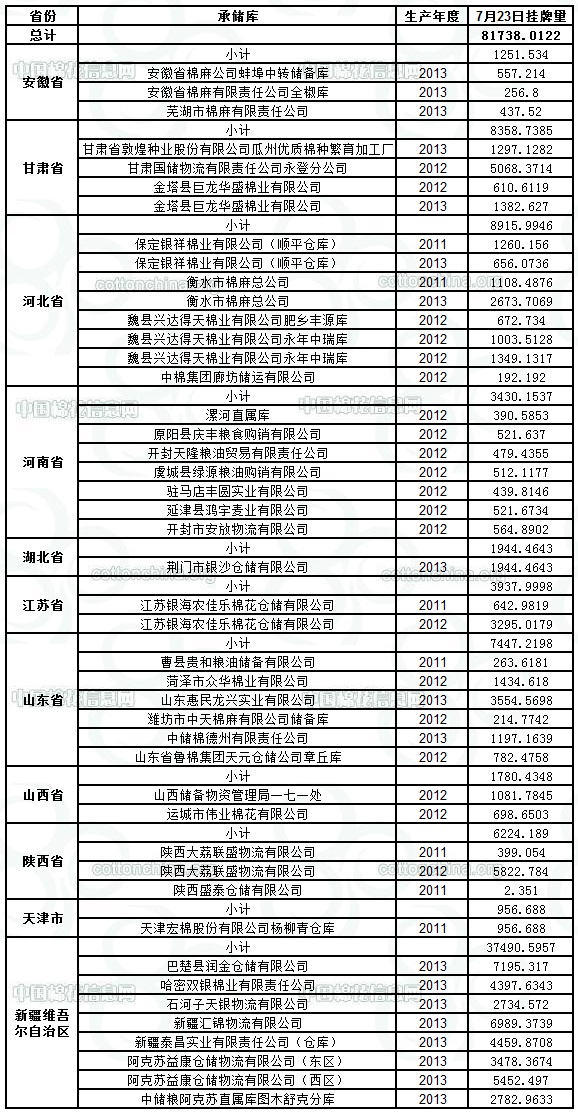 定于7月23日出庫銷售儲備棉81738.0122噸。其中2011年資源4633.3366噸,2012年資源25656.8122噸,2013年資源51447.8634噸。相關(guān)批次公檢數(shù)據(jù)見附件,具體庫點如下: