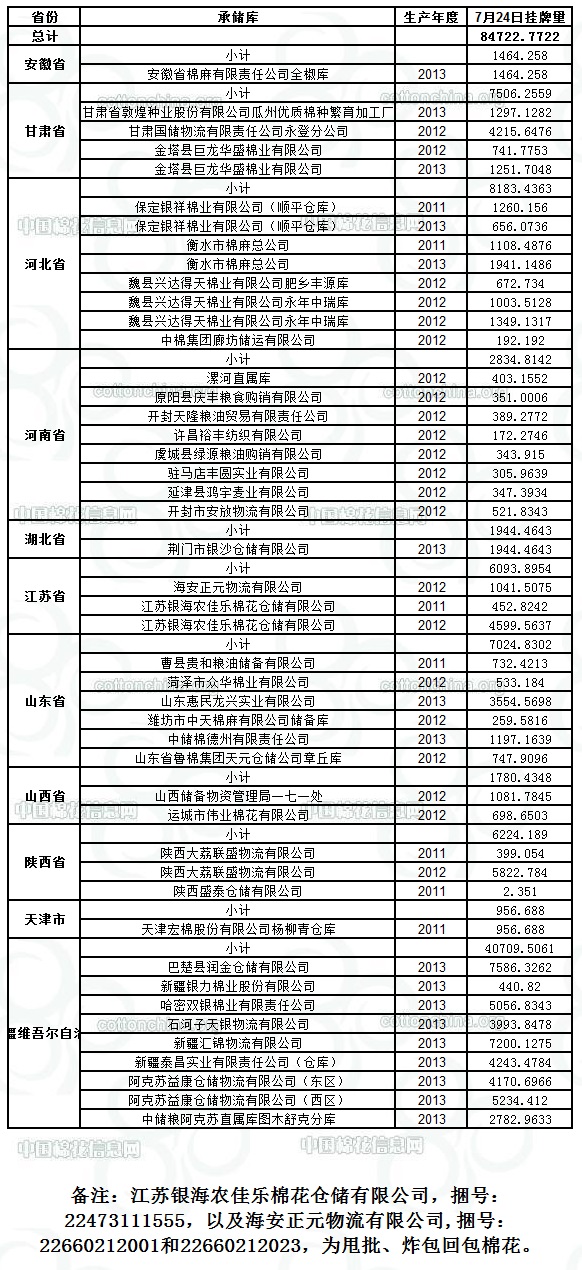 定于7月24日出庫(kù)銷售儲(chǔ)備棉84722.7722噸。其中2011年資源4911.9821噸,2012年資源25794.7728噸,2013年資源54016.0173噸。相關(guān)批次公檢數(shù)據(jù)見附件,具體庫(kù)點(diǎn)如下: