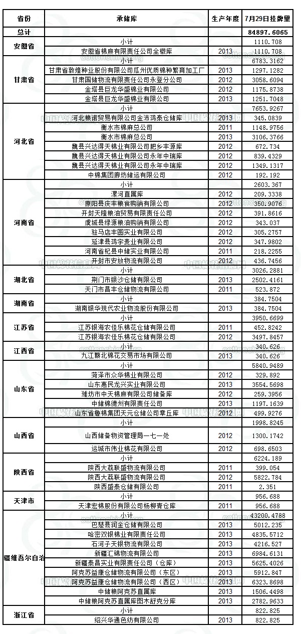 定于7月29日出庫銷售儲備棉84897.6065噸。其中2011年度國產(chǎn)棉3701.9903噸,2012年度國產(chǎn)棉22081.7847噸,2013年度國產(chǎn)棉59113.8315噸。今日無進口棉。相關(guān)批次公檢數(shù)據(jù)見附件。具體庫點如下: