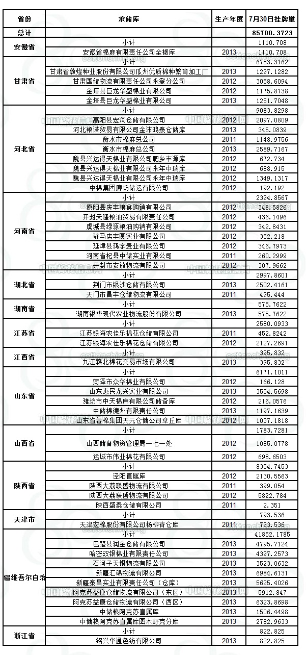 各紡織企業(yè): 定于7月30日出庫銷售儲備棉85700.3723噸。其中2011年度國產(chǎn)棉3552.4847噸,2012年度國產(chǎn)棉24652.7985噸,2013年度國產(chǎn)棉57495.0891噸。今日無進口棉。相關(guān)批次公檢數(shù)據(jù)見附件。具體庫點如下: