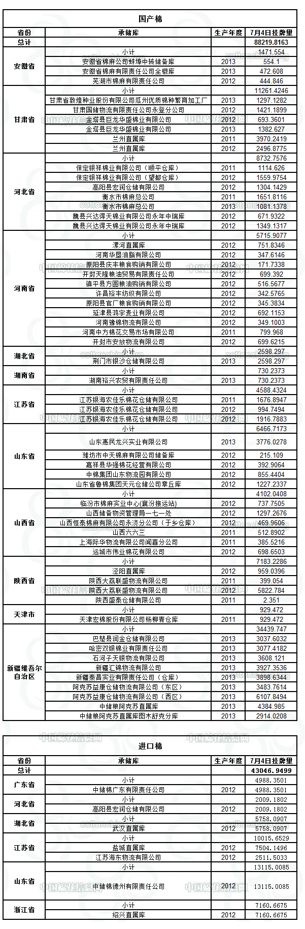 各紡織企業(yè): 定于7月4日出庫銷售儲備棉131266.7662噸。其中,國產(chǎn)棉88219.8163噸,進口棉43046.9499噸。相關(guān)批次公檢數(shù)據(jù)見附件。具體庫點如下: