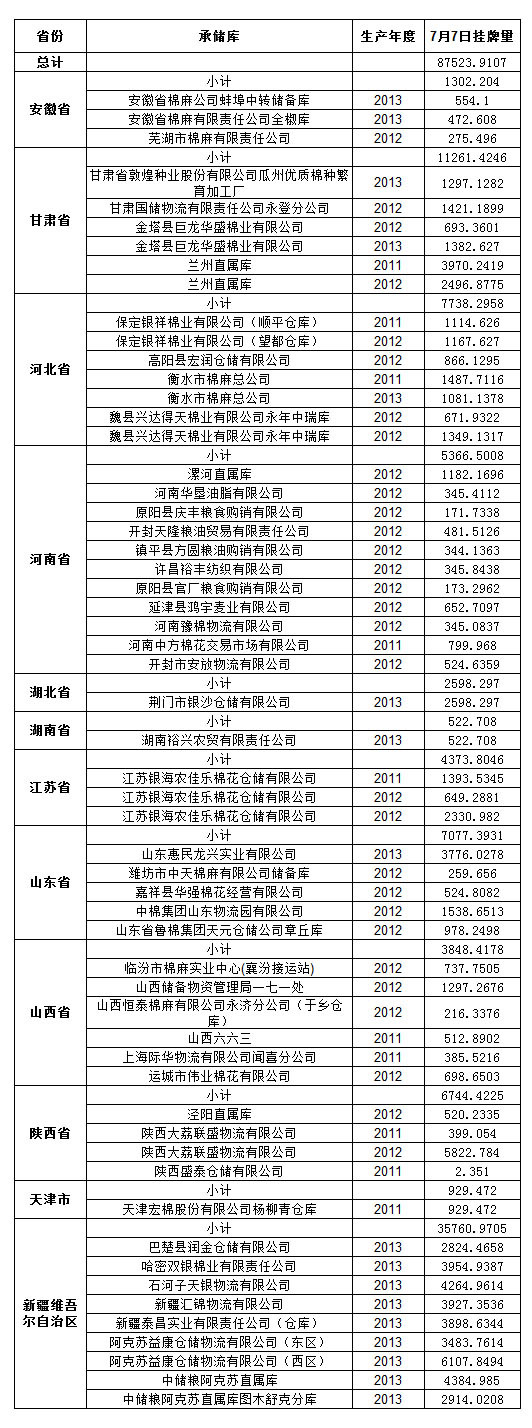 定于7月7日出庫銷售儲備棉87523.9107噸。其中2011年資源10995.3708噸,2012年資源29082.9356噸,2013年資源47445.6043噸。相關(guān)批次公檢數(shù)據(jù)見附件,具體庫點如下: