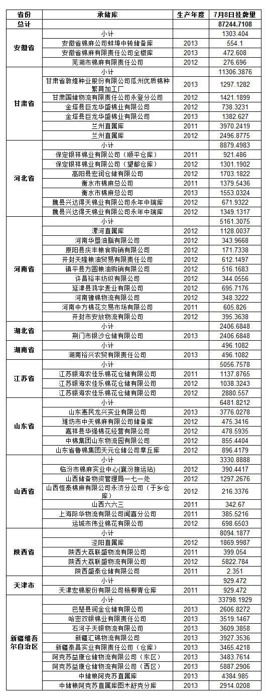 定于7月8日出庫銷售儲備棉87244.7108噸。其中2011年資源10074.0426噸,2012年資源31434.1589噸,2013年資源45736.5093噸。相關批次公檢數(shù)據(jù)見附件,具體庫點如下: