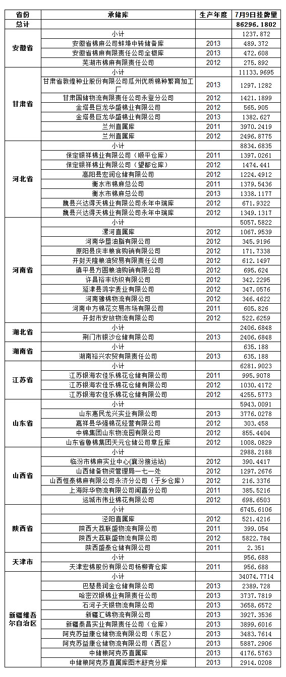 定于7月9日出庫(kù)銷售儲(chǔ)備棉86296.1802噸。其中2011年資源10092.16噸,2012年資源30331.4953噸,2013年資源45872.5249噸。相關(guān)批次公檢數(shù)據(jù)見附件,具體庫(kù)點(diǎn)如下:
