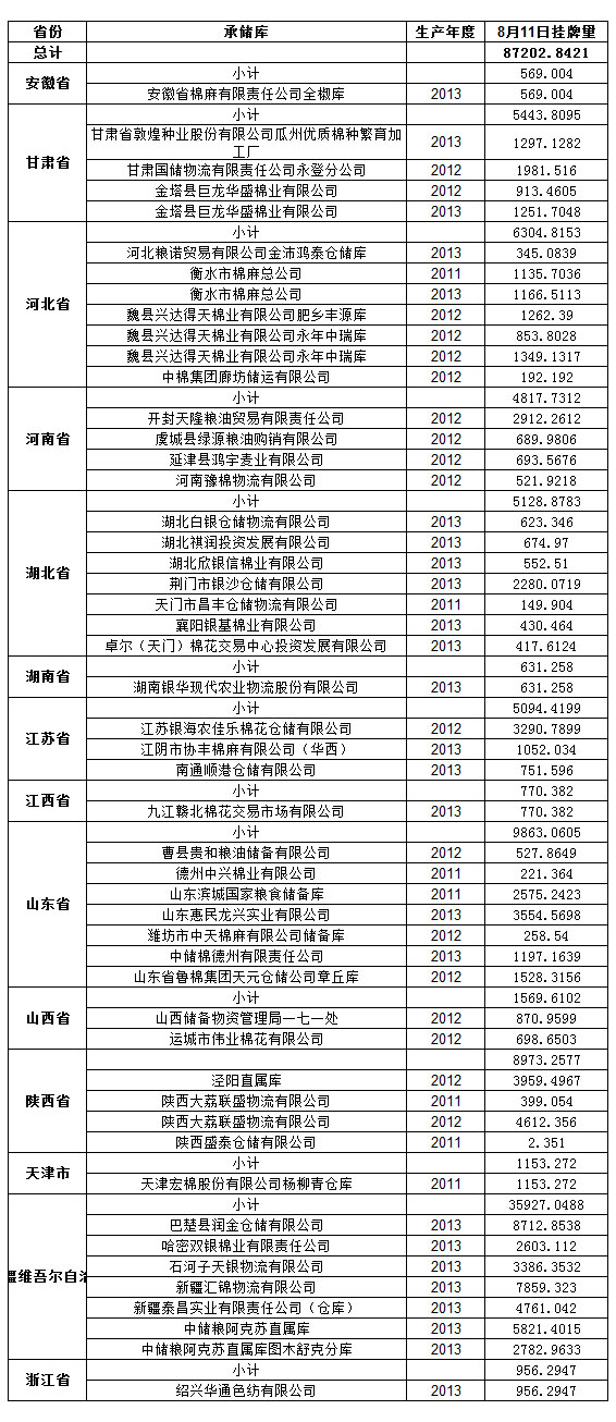 各紡織企業(yè): 定于8月11日出庫銷售儲備棉87202.8421噸。其中2011年度國產(chǎn)棉5636.8909噸,2012年度國產(chǎn)棉27117.1975噸,2013年度國產(chǎn)棉54448.7537噸。今日無進(jìn)口棉。相關(guān)批次公檢數(shù)據(jù)見附件。具體庫點(diǎn)如下: