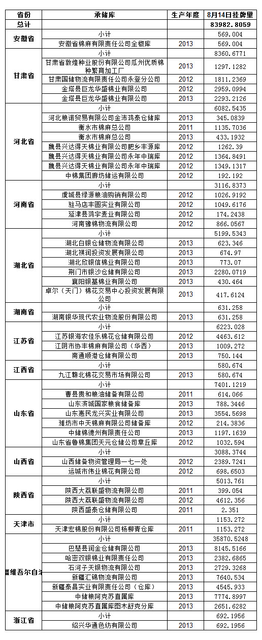 各紡織企業(yè): 定于8月14日出庫銷售儲備棉83982.8059噸。其中2011年度國產(chǎn)棉3304.4466噸,2012年度國產(chǎn)棉25467.0564噸,2013年度國產(chǎn)棉55211.3029噸。今日無進口棉。相關批次公檢數(shù)據(jù)見附件。具體庫點如下: