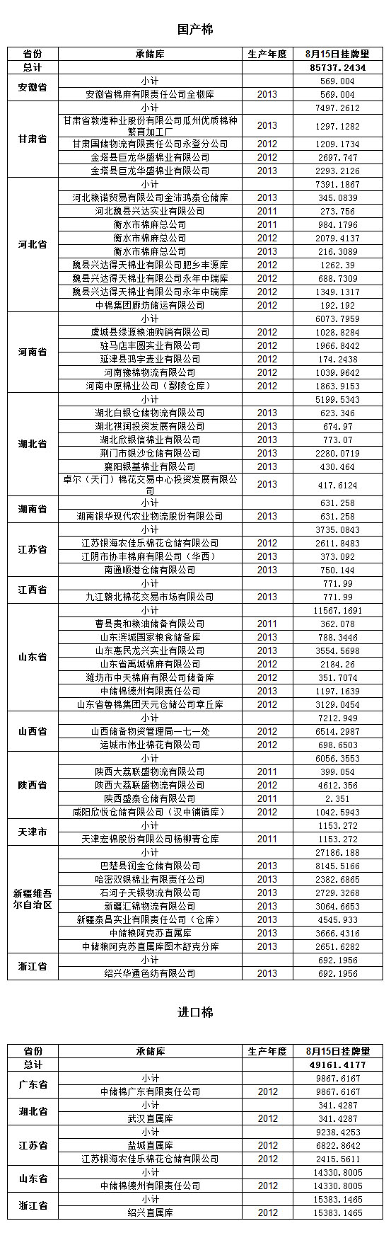 定于8月15日出庫銷售儲(chǔ)備棉134898.6611噸。其中國產(chǎn)棉85737.2434噸(2011年度國產(chǎn)棉3174.6906噸,2012年度國產(chǎn)棉36697.335噸,2013年度國產(chǎn)棉45865.2178噸),進(jìn)口棉49161.4177噸。相關(guān)批次公檢數(shù)據(jù)見附件。具體庫點(diǎn)如下:
